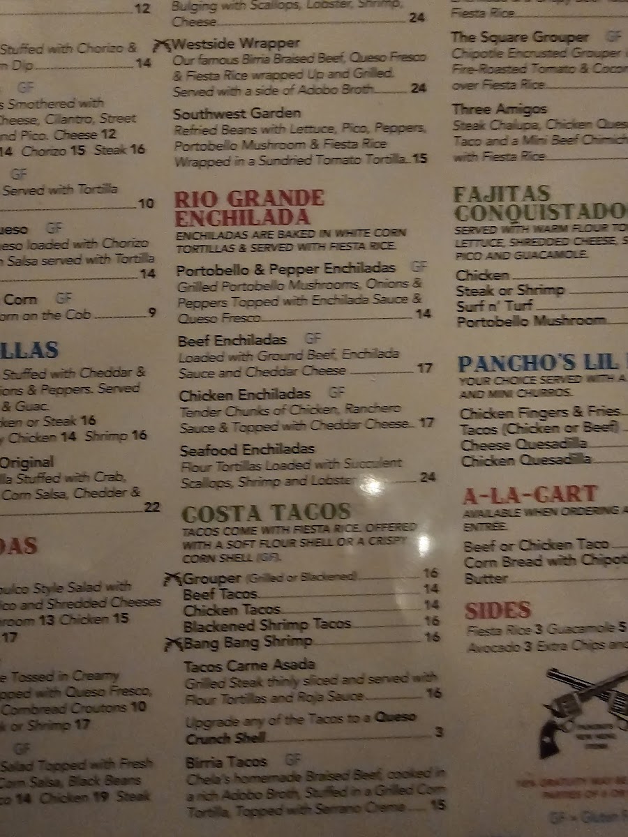 Highlights include the Fajitas Conquistador, where succulent chicken, steak, or shrimp meets sautéed onions and peppers, perfectly wrapped in warm tortillas. For something crispy, try the Chimichanga, a delightful fried treat accompanied by our signature Fiesta fried rice. Seafood lovers won't want to miss the Rio Grande Enchilada, loaded with scallops, shrimp, and lobster that captures the essence of coastal dining.